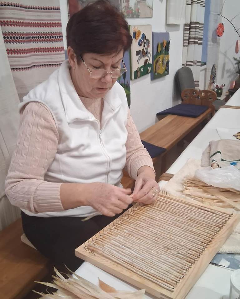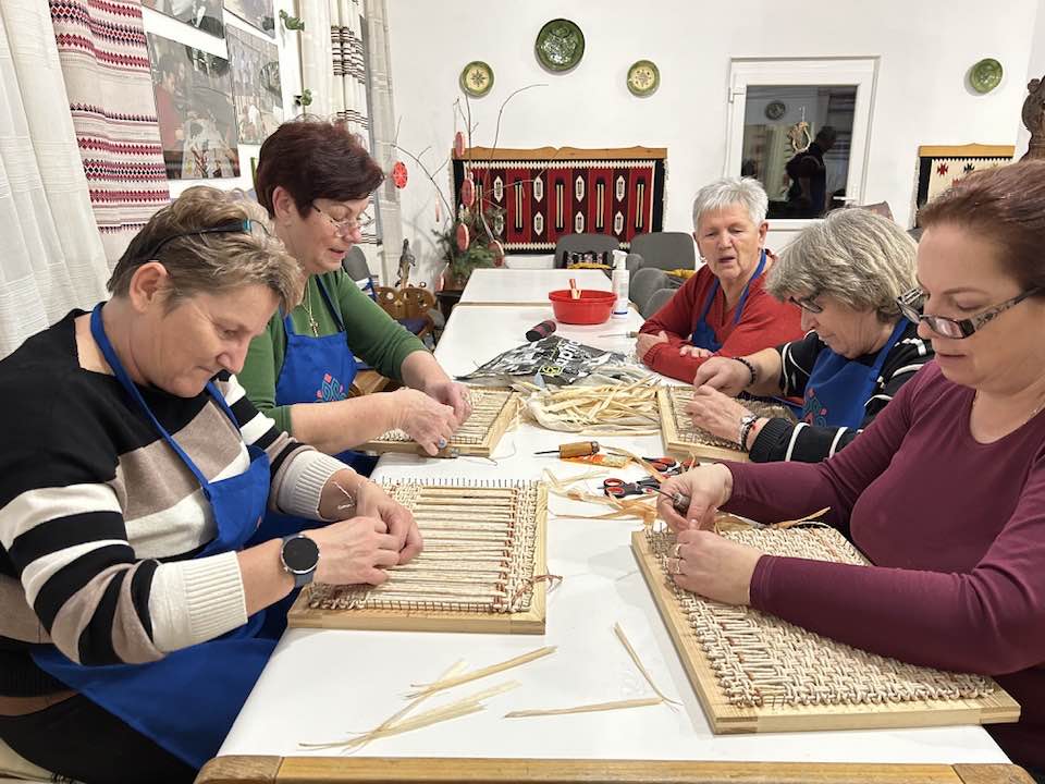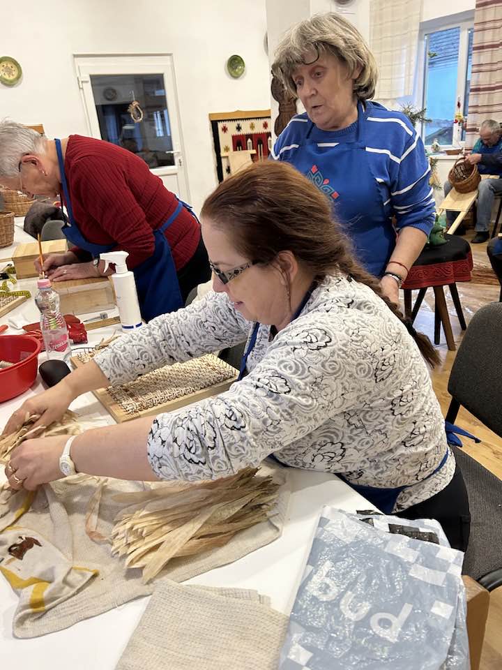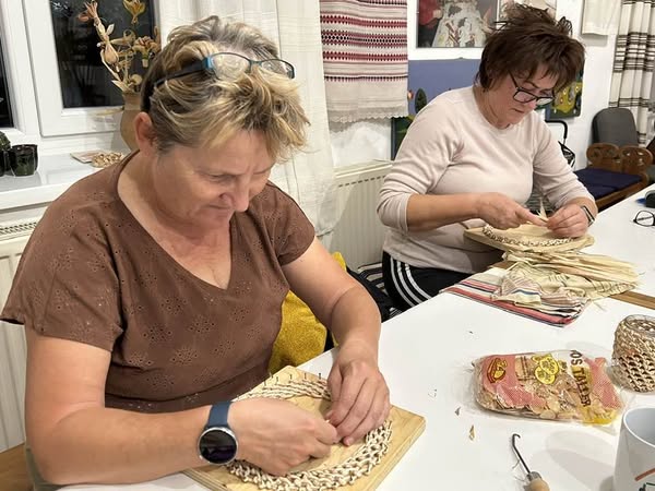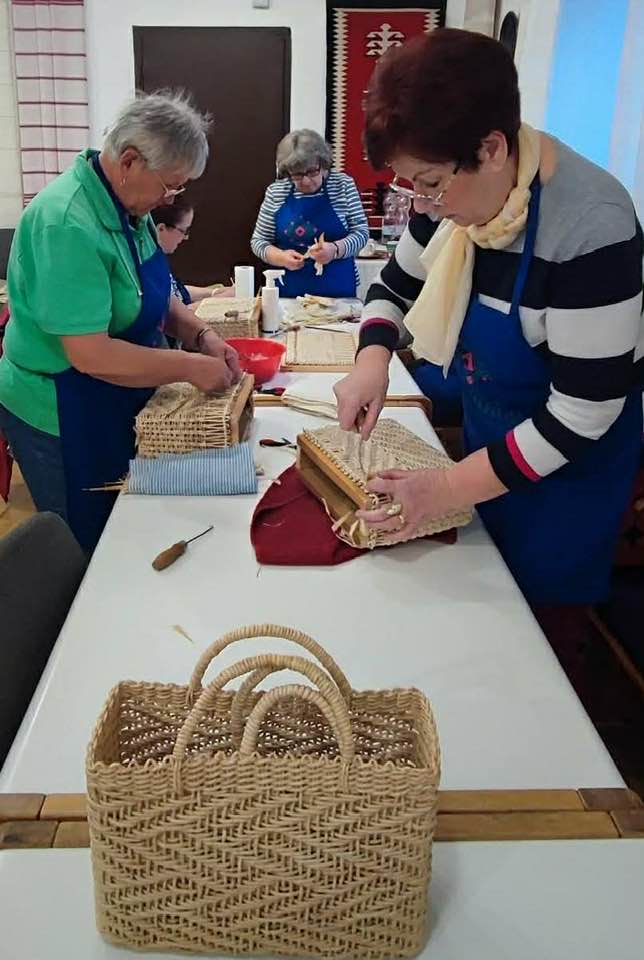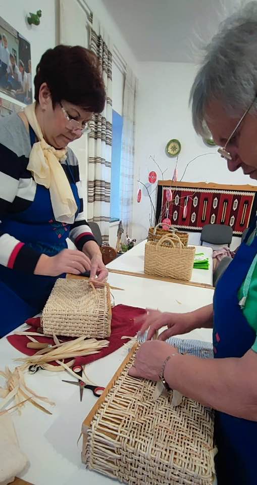 Készülnek a “szatyorkáink”. Ügyes kezek Baloghné Mártika irányításával, aszakköri foglalkozás keretében csuhéból fonják a formás táskákat.