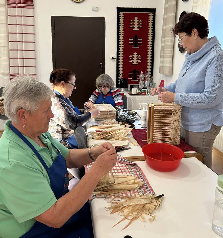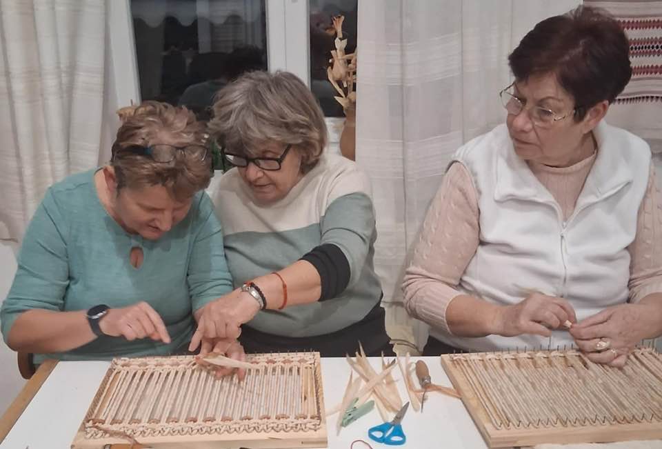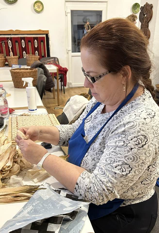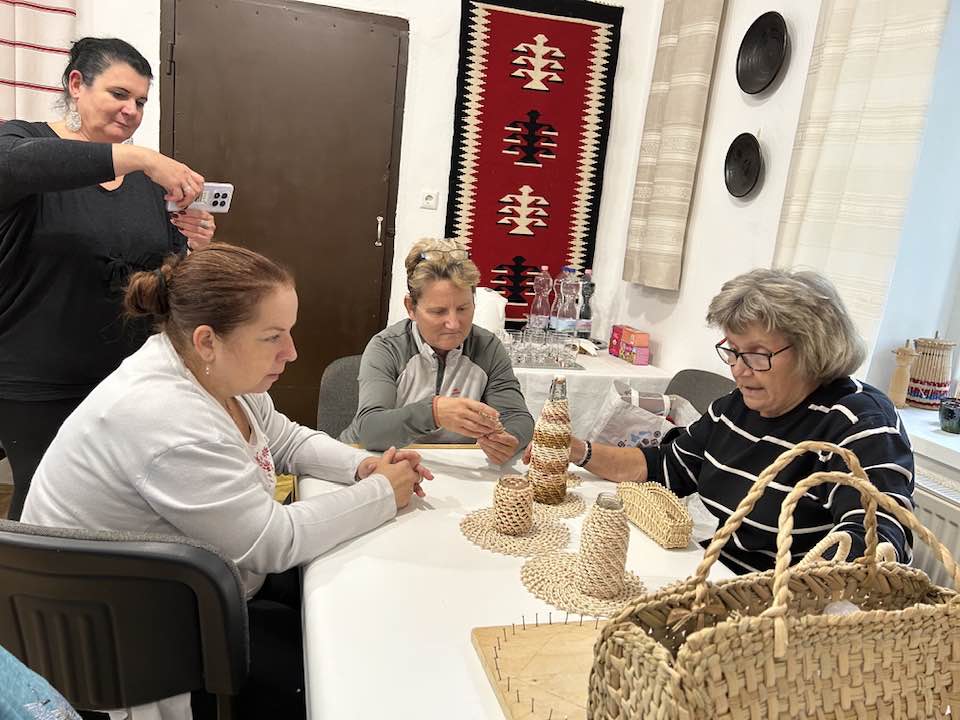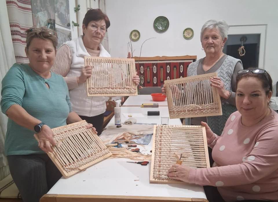 Készülnek a “szatyorkáink”. Ügyes kezek Baloghné Mártika irányításával, aszakköri foglalkozás keretében csuhéból fonják a formás táskákat.