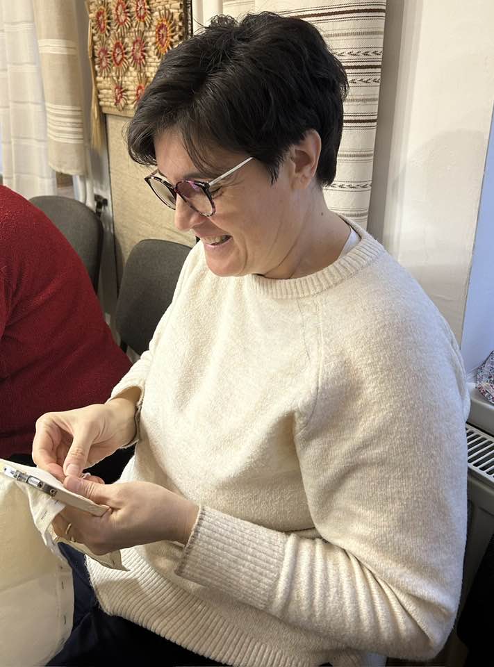 Palóc szálhúzásos és keresztszemes mintákkal ismerkednek az adzakkör tagjai. Pataki Miklósné, a Népművészet Mestere évek óta dolgozik